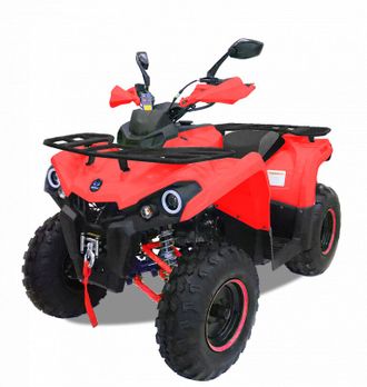 В богатейшую базовую комплектацию входят: усиленный передний и задний багажники, лебедка с пультом дистанционного управления, линзованная головная оптика с режимом дальнего и ближнего света фар, светодиодные передние и задние габаритные огни, выполненные в современном дизайне, передние и задние указатели поворотов, электронная панель приборов с функцией спидометра, тахометра, счетчиком пройденного пути, индикацией включённой передачи, индикацией режима дальнего света фар, указателем поворотов, электрический стартер и резервный механический (ручной стартер), USB розетка, усиленная 530 приводная цепь, мощный фаркоп со стандартным шаром 50 мм., газо масляные амортизаторы с бесступенчатой регулировкой жесткости пружин, широкие подножки с подпятниками для заднего пассажира, спинка для заднего пассажира, широкое сиденье, дисковые гидравлические тормоза спереди и сзади, стояночный тормоз на передние и задние колёса. Независимая передняя подвеска, на мощных, съемных шаровых опорах. Во всех шарнирных соединениях передней и задней подвески имеются пресс маслёнки, что позволяет продлить срок службы этих узлов и благоприятно сказывается на эксплуатации и стоимости владения данным квадроциклом. В придачу на данной модели тихий выхлоп с приятным звуком. Всё это пригодится, как для отличного время препровождения на природе и умеренном бездорожье, как и в помощи при ведении подсобного хозяйства!